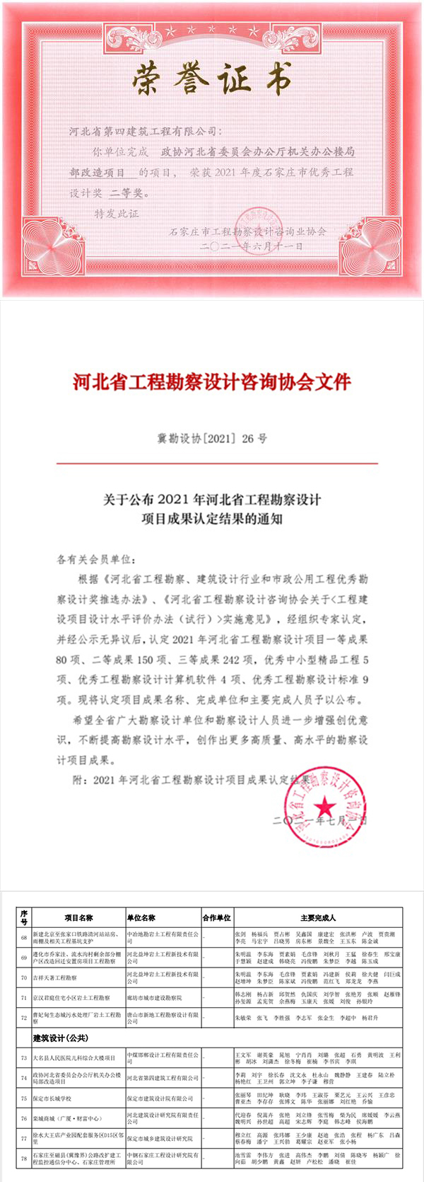 7月5日,公司設計院收到榮譽(yù)證書(shū)和文件,《政協(xié)河北省委員會(huì )辦公廳機關(guān)辦公樓局部改造項目》獲2021年石家莊市優(yōu)秀工程設計獎二等獎、河北省工程勘察設計項目成果獎三等獎。